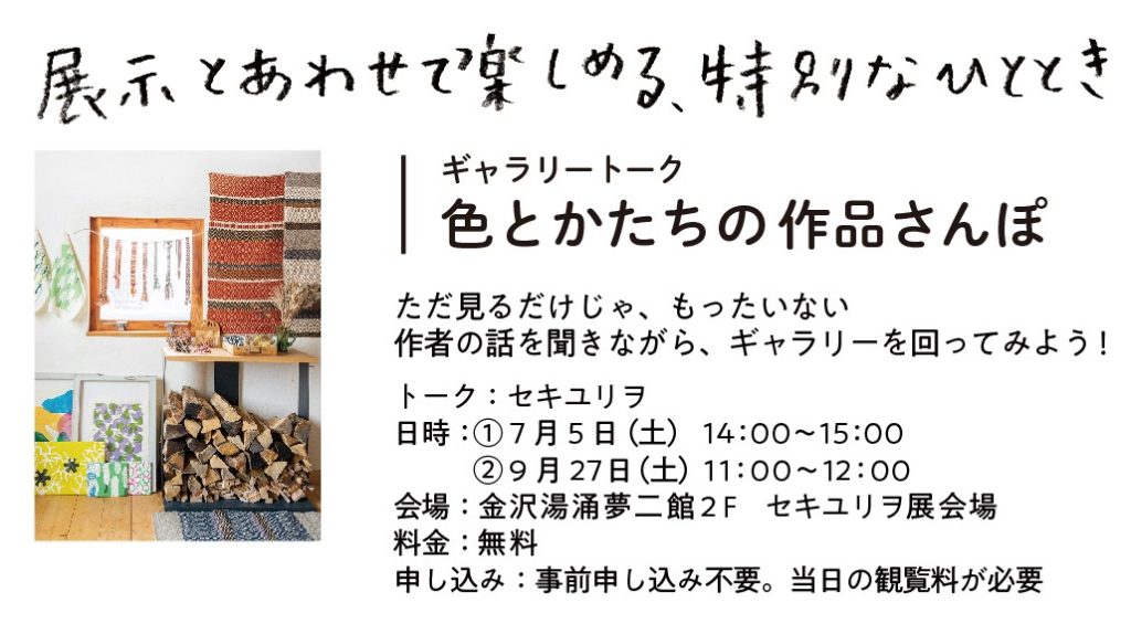 9月27日(土)セキユリヲさんによるギャラリートーク「色とかたちの作品さんぽ」開催します 2025.08.09 トーク:セキユリヲ 日時:9月27日(土)11:00~12:00 会場:金沢湯涌夢二館2F セキユリヲ展会場 料金:無料(別途観覧料要) 申込み:事前申込み不要 ギャラリートーク